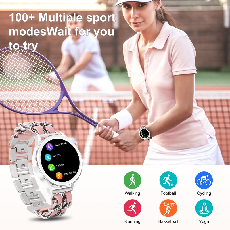 - 💎【Fitness Watch for Women】It tracks your health data, the scientific and real-time exercise data for 100 exercise modes like run, dance, rope-jump, tennis, basketball,which helps you train more efficiently and can help you record your menstrual and ovulation periods, and alert you before they arrive so that you can plan ahead and avoid disruptions. If you're pregnant, you can still stay in tune with your body by using pregnancy tracking.