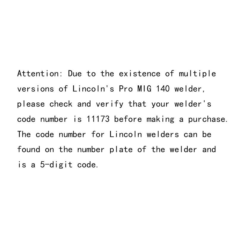 Attention: Due to the existence of multiple versions of Lincoln's Pro MIG 140 welder, please check and verify that your welder's code number is 11173 before making a purchase. The code number for Lincoln welders can be found on the number plate of the welder and is a 5-digit code.