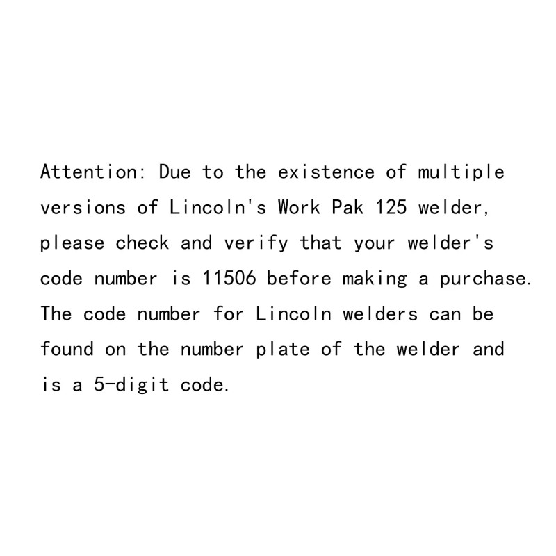 Attention: Due to the existence of multiple versions of Lincoln's Work Pak 125 welder, please check and verify that your welder's code number is 11506 before making a purchase. The code number for Lincoln welders can be found on the number plate of the welder and is a 5-digit code.