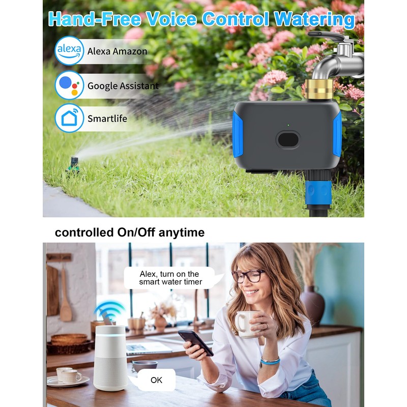 - Voice Control & Low Battery Warning: You don't have always to open the App when you're busy! The system can be operated with voice control via a WiFi hub from Alexa or Google Assistant. The control system operates on a pair of 1.5v alkaline batteries with a lifespan of more than 6 months. The hose water timer will shut off automatically when the battery goes below 5% to protect the timing system and prevent over-watering.