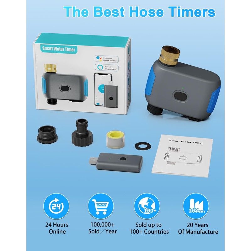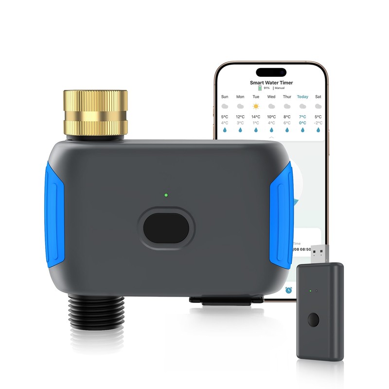 - WiFi & Bluetooth Connection: It comes with a Wi-Fi hub to facilitate connecting to your network which is especially useful if your outdoor faucet or hose bib is too far from your Wi-Fi router to get a good signal. You can manage your watering schedule even if you aren't home, as long as your phone has access to the internet. It combines Wi-Fi and Bluetooth functions, which means more stable, longer-range connectivity, and allows you to connect your phone via Bluetooth(50ft) in addition to Wi-Fi.