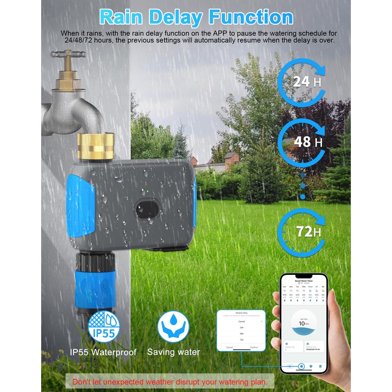- Rain Delay & Manual Watering: Don't let unexpected weather disrupt your watering plan. With the rain delay function, the Wi-Fi timer can delay your schedule to 24/48/72 hours via APP, ensuring your plants are not overwatered or underwatered. When you need to water temporarily, you can turn on the manual mode via the App according to your needs without affecting your set watering schedule.