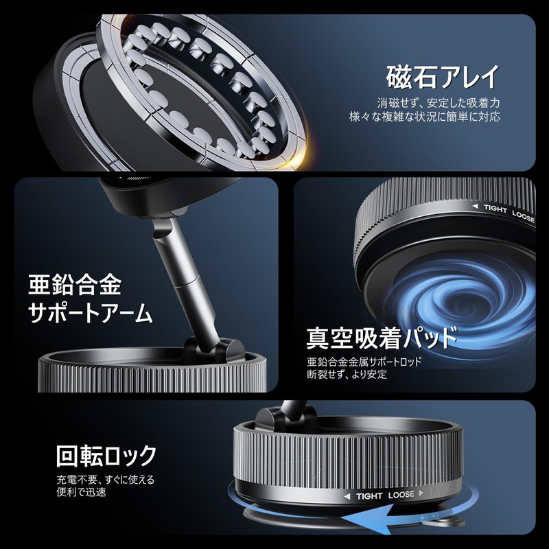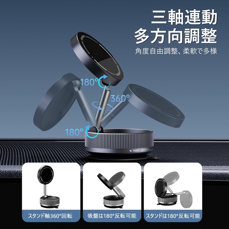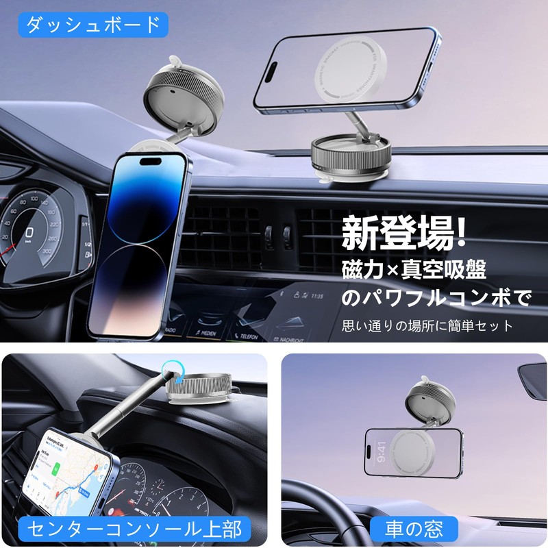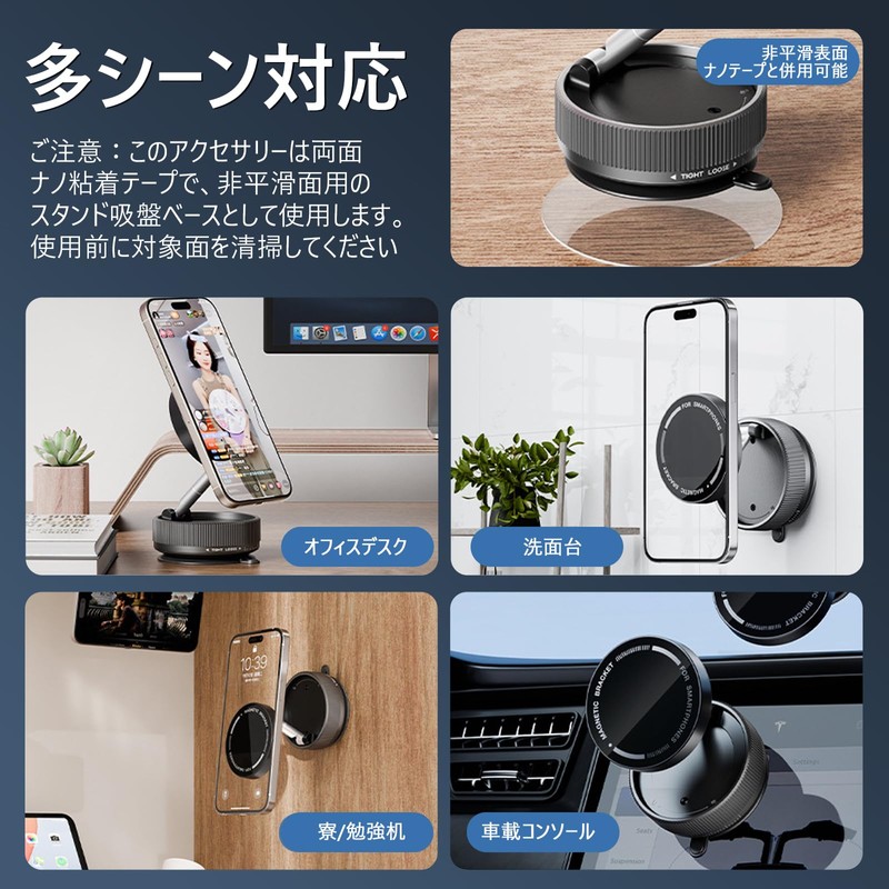 - (Adjustable Angles & New Folding Design) Revolutionizes the "hassle of arm operation" that traditional smartphone holders can hold. Magnetic smartphone stand (vacuum suction & 3-axis interlocking mechanism), angle adjustable. 360 degree rotating arm + 180 degree reverse base instantly set the best position One Second Hand Angle Adjustment: Optimizes visibility to match the driver's physique and seat position. Smooth Surface: Lightly rotate the base → "Click" and lock! Easy to remove by simply pulling the air release valve and rotating it in the opposite direction. Textured Surface: Just stick the included "Nano Suction Pad" to press it for 5 seconds. Before use, always wipe off the dust on the ground (*maximum adsorption power) when not in use, the holder can be folded to keep the car in a neat and simple space