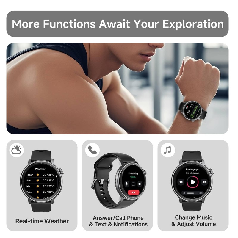 - 【Vivid AMOLED Display & Multi-style Dials】This smart watch is equipped with a 1.43" HD AMOLED screen that offers an astonishing visual experience, run smoothly and without any lag. Even in direct sunlight, it can provide a bright and clear display. The Always-On Display (AOD) mode makes the smart watch easy to use in various environments, and its 400mAh large battery is sufficient for 8-10 days of daily use. 100+ dials available for you to choose from. Of course, you can also upload photos or video clips to customize your own exclusive dial to create an appearance that shows your style and personality.