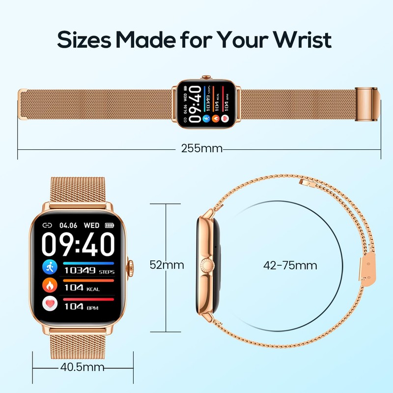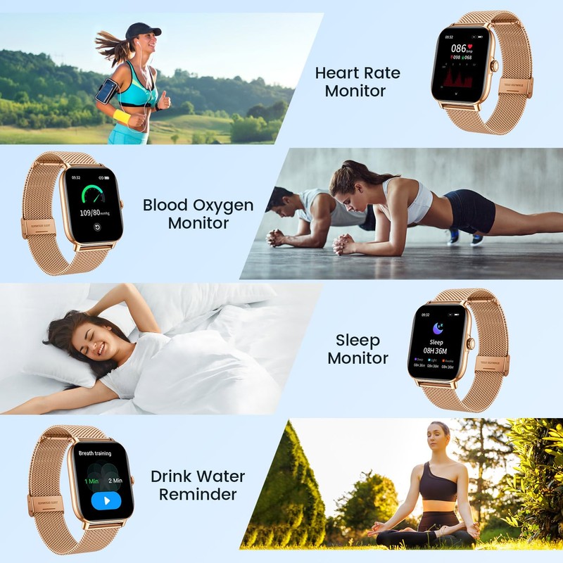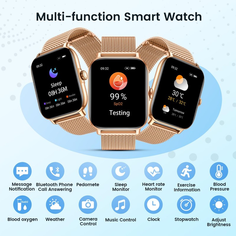• Smart health monitoring: with the leading optical sensor, the women's smart watch helps you track and analyse heart rate and blood oxygen. Fitness watch automatically monitors your sleep status and provides a comprehensive analysis of sleep quality. Menstrual cycle, drinking water, high heart rate, low blood oxygen and other warnings can help you understand your physical condition and make appropriate adjustments