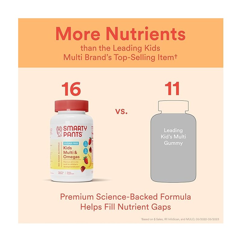 • PREMIUM, SCIENCE-BACKED SUGAR FREE KIDS GUMMIES: SmartyPants Sugar Free Kids & Omegas contains more nutrients than the leading kids multivitamin brand’s top-selling item and helps fill nutrient gaps. Based on $ Sales, IRI InfoScan, & MULO, 05/2022-05/2023