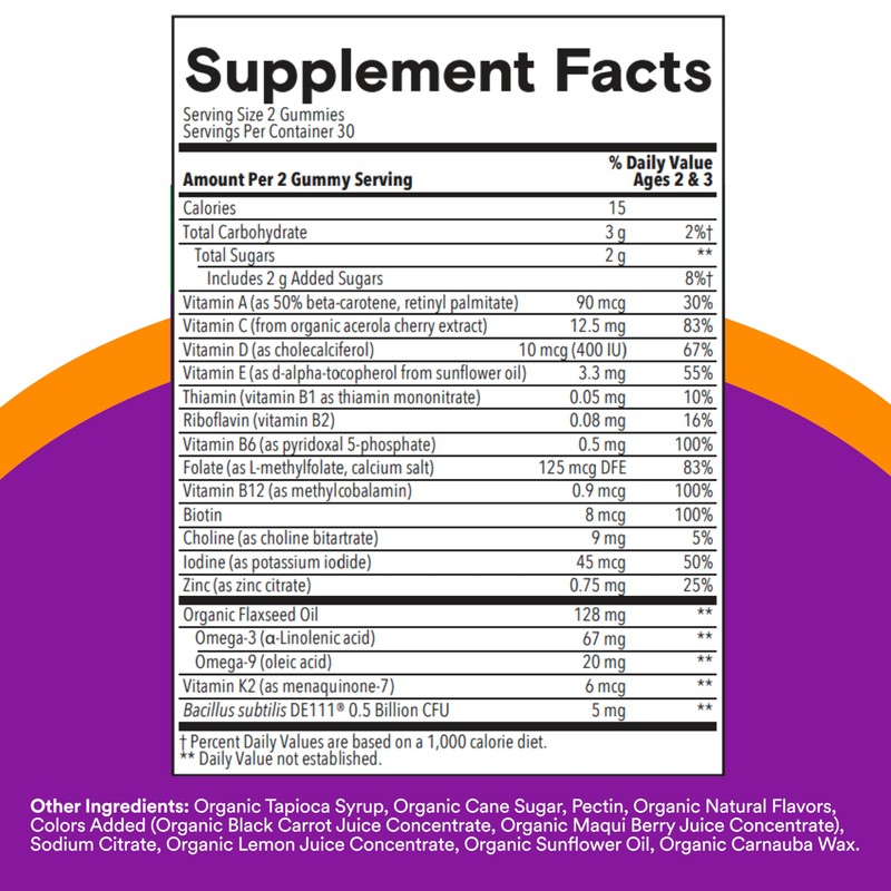 SmartyPants Organic Toddler Multivitamin Gummies: Probiotics, Omega 3 (ALA), Vitamin D3, C, Vitamin B12, B6, A, K & Zinc, Beta Carotene, Gluten Free, Three Fruit Flavors, 60 Count (30 Day Supply)
