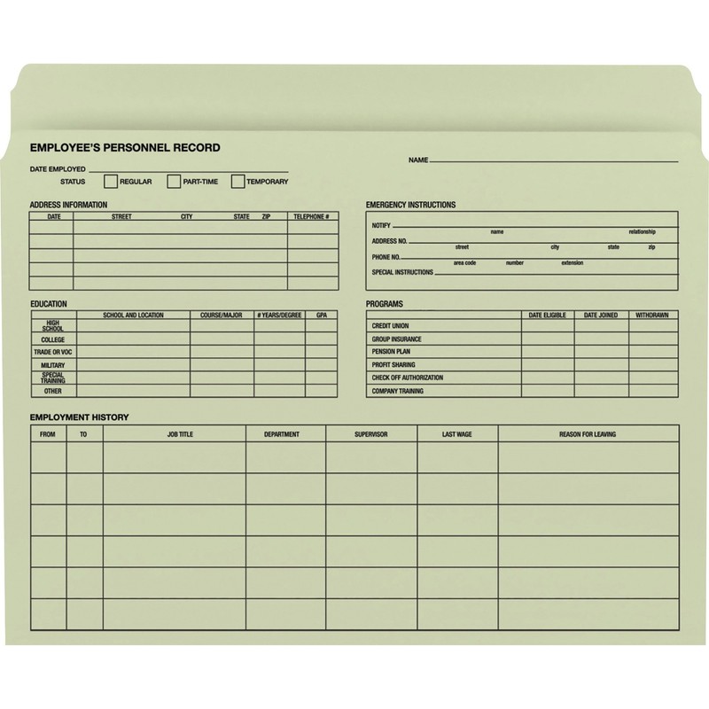 Employee record file folders are ideal for maintaining confidential employee information in a consistent format. For added security, the folder may be reversed so that all information written on the preprinted forms appears on the inside of the folder.