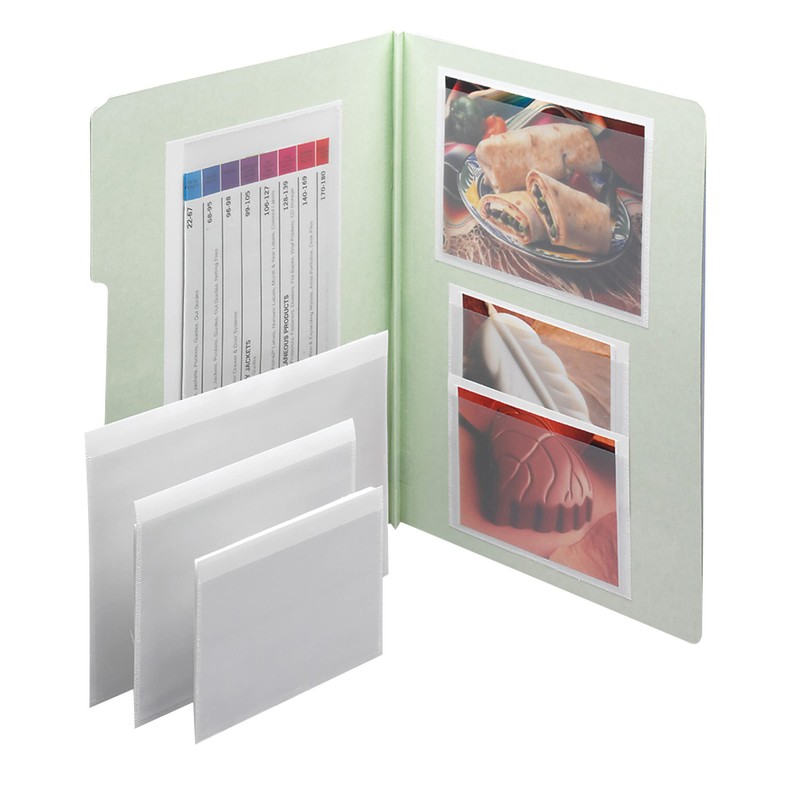 - Permanent self-adhesive pockets adhere to file pockets, jackets, folders, binders and most surfaces where images, inventory lists or small incidentals need to be placed