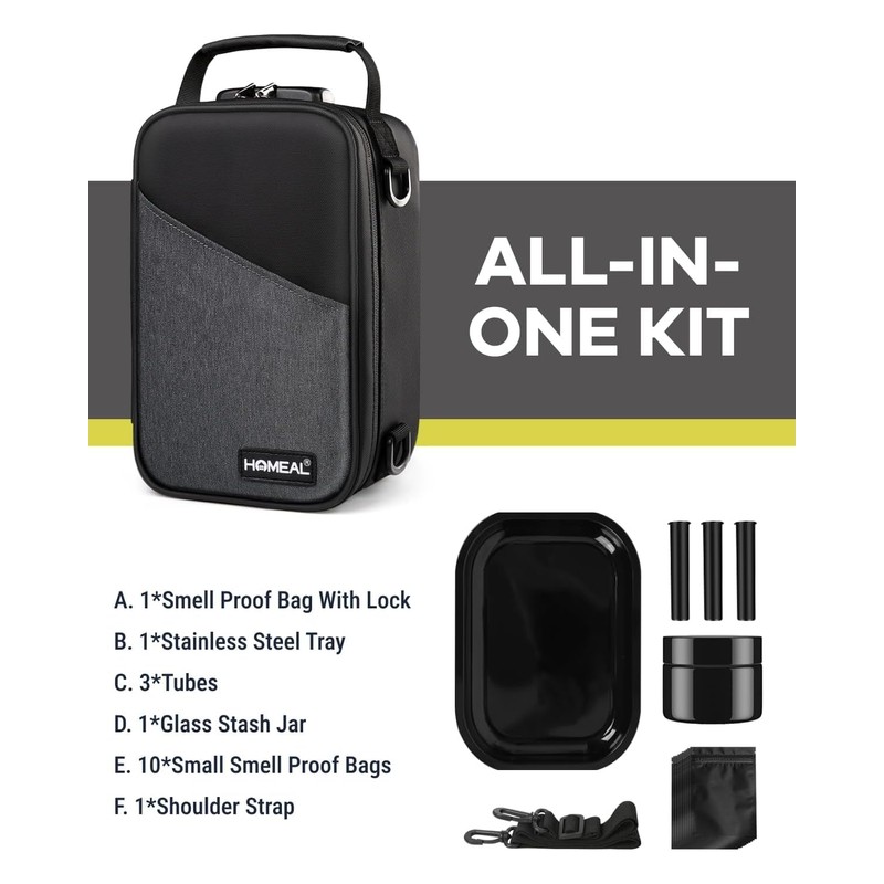 - LARGE SMELL PROOF BAG KIT:This smell proof bag kit comes with 1 smell proof bag with lock,1tray, 1 jar, 10 small smell proof bags, 3 tubes to save your time and money.We offer one adjustable shoulder strap and comfortable handle give you two options to carry.The smell proof stash bag is ideal smell proof box for personal items,strong smell stuff and travel items etc.
