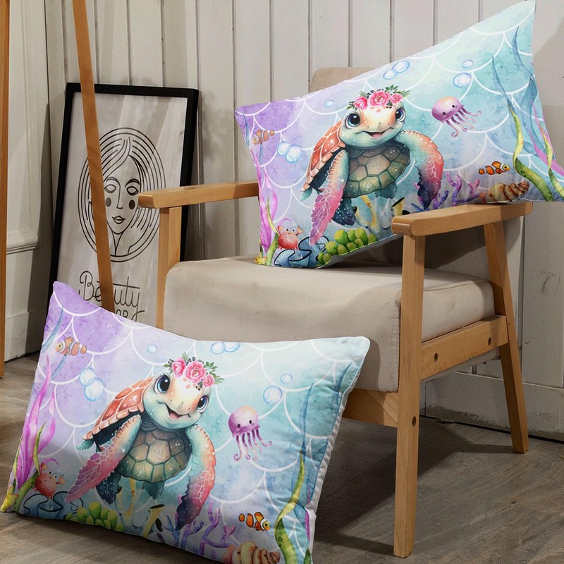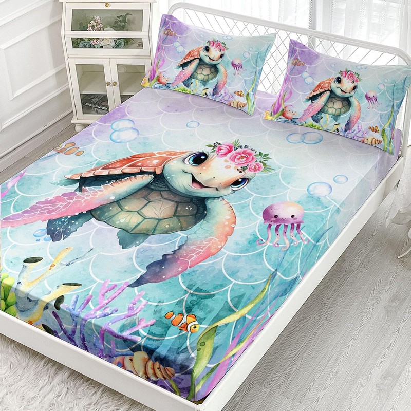 Smell Sunshine Kids Marine Life Printed Sheet Set - 4 Pcs, Colorful Turtle Twin with 1 Flat Sheet, 1 Fitted Sheet + 2 Pillowcases