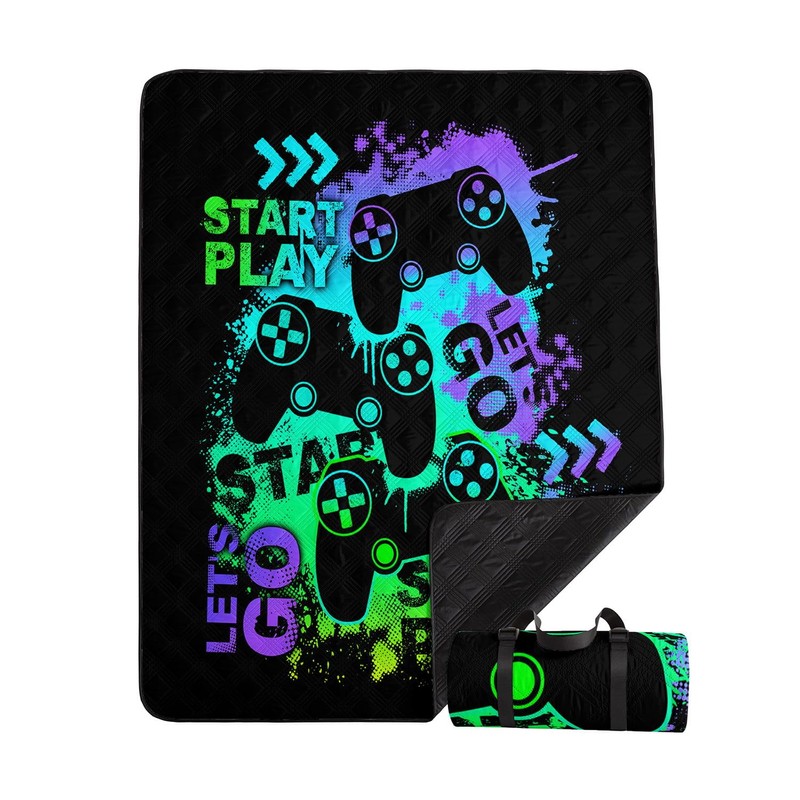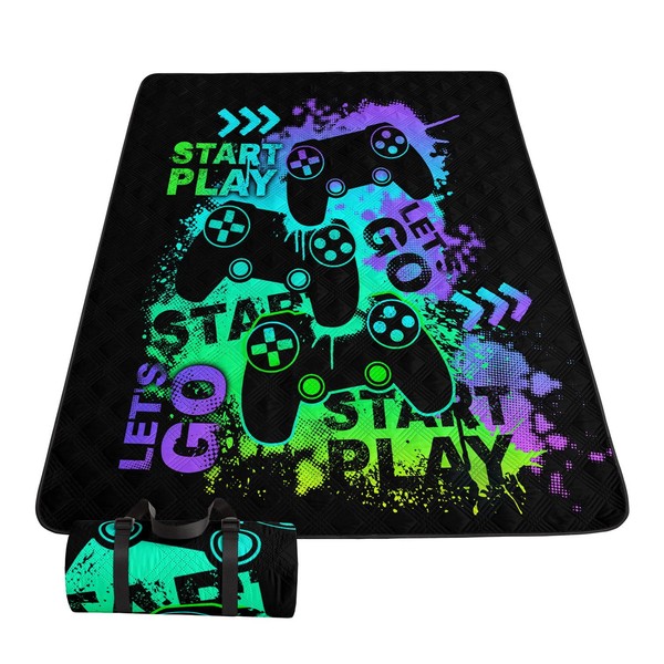 Smell Sunshine Outdoor Picnic Blanket,Portable Sandproof Waterproof Picnic Mat,Green Gamepad Printed Camping Beach Mat for Sand and Wet Grass Hiking (Green Gamepad L)