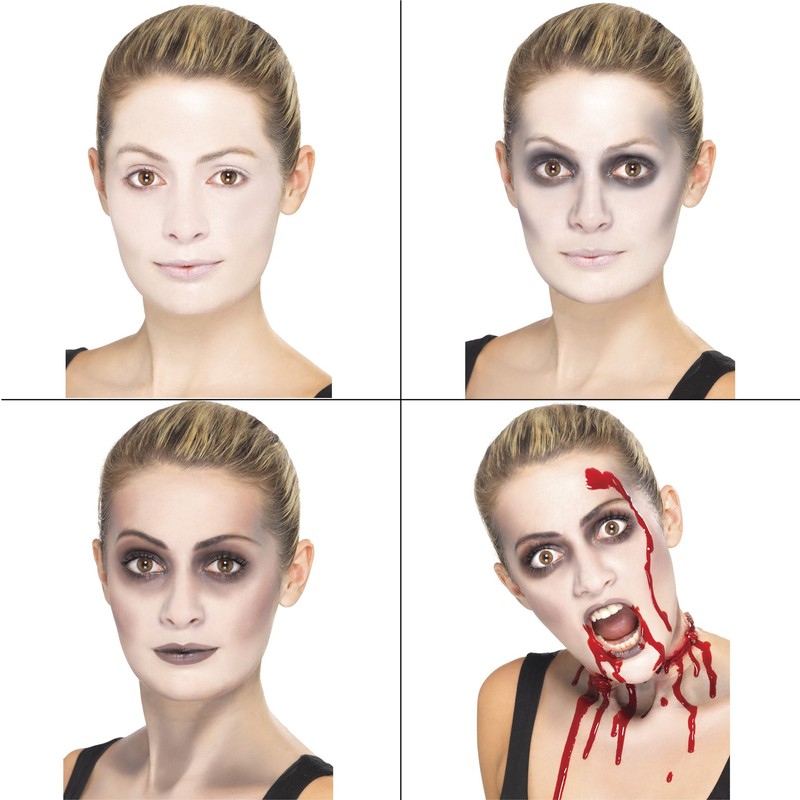 - This set contains make-up, blood capsules and a sponge. Easy to use for dramatic results. Refine your zombie costume with this zombie makeup set.. Happy Halloween. Professional look