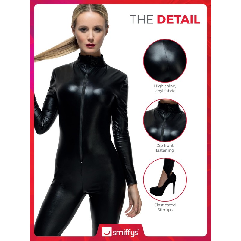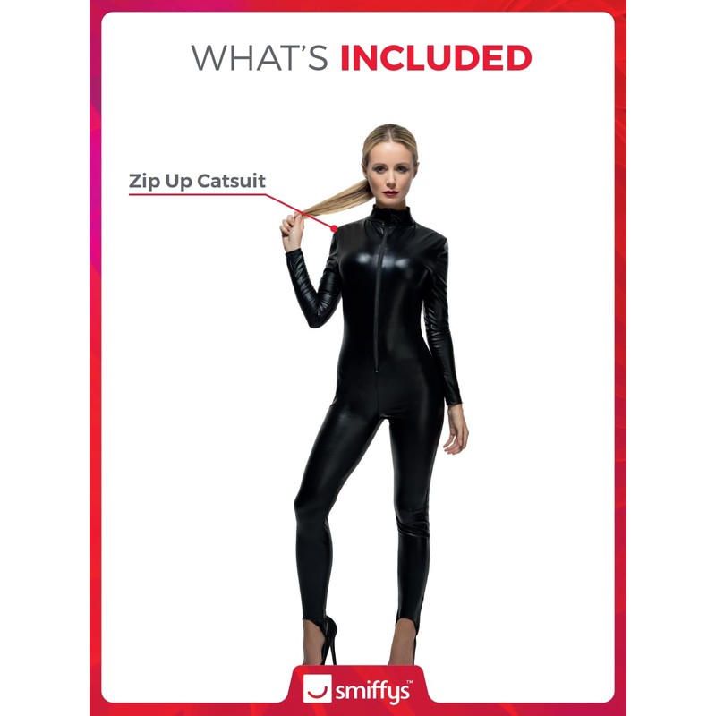 - Includes Fever Miss Whiplash Costume, Black, with Zip Up Catsuit