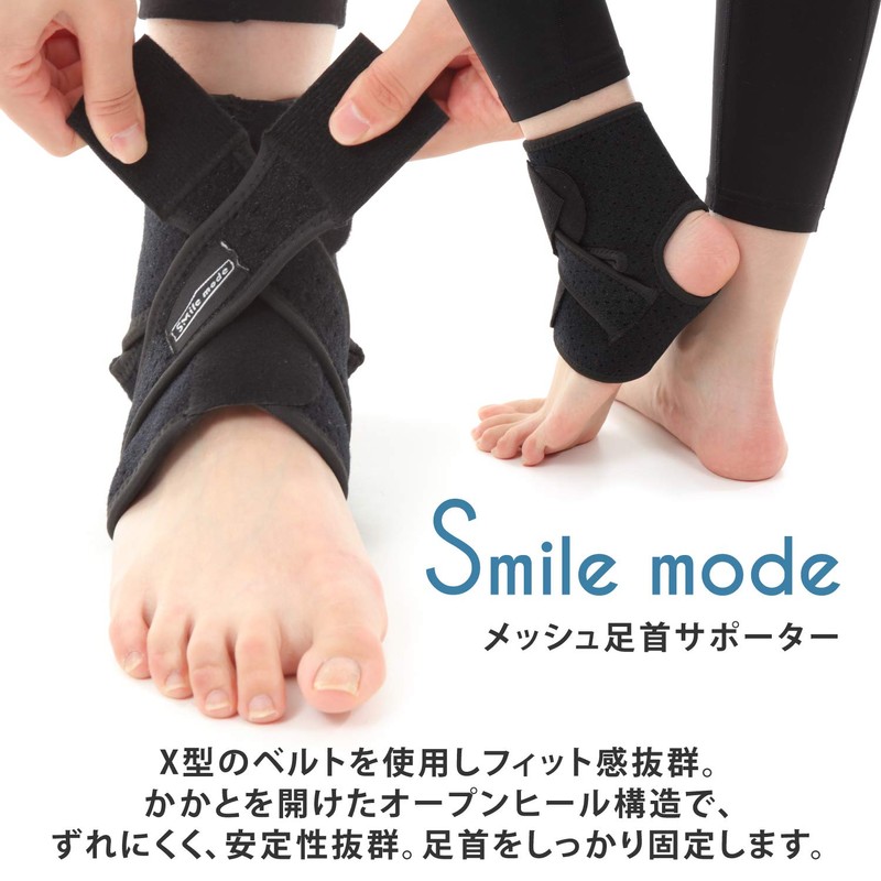 - Smile Mode Ankle Supporter 8 Features: 1. Uses an X-shaped belt for an excellent fit. 2. Open heel construction prevents slippage and provides excellent stability. Secures ankle tightly. 3. The mesh material is breathable and does not get stuffy, so you can wear it for a long time. 4. The strong Velcro strap makes it easy to put on and take off and adjust the position and tightening strength freely. 5. Adopts Velcro that does not stick to clothing. 6. Sturdy stitching for durability. 7. Available in 4 sizes S, M, L, XL, and left and right for both men and women. 8. Reliable 3-month manufacturer warranty