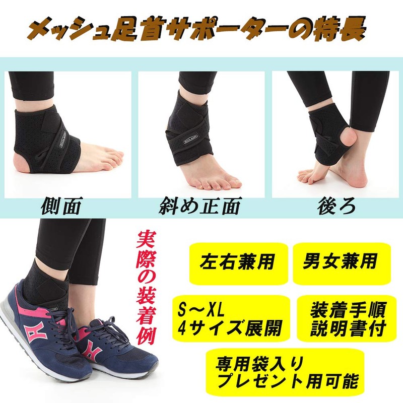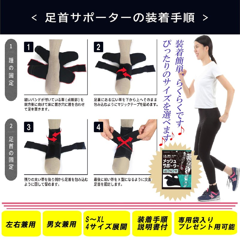 - Smile Mode Ankle Supporter 8 Features: 1. Uses an X-shaped belt for an excellent fit. 2. Open heel construction prevents slippage and provides excellent stability. Secures ankle tightly. 3. The mesh material is breathable and does not get stuffy, so you can wear it for a long time. 4. The strong Velcro strap makes it easy to put on and take off and adjust the position and tightening strength freely. 5. Adopts Velcro that does not stick to clothing. 6. Sturdy stitching for durability. 7. Available in 4 sizes S, M, L, XL, and left and right for both men and women. 8. Reliable 3-month manufacturer warranty