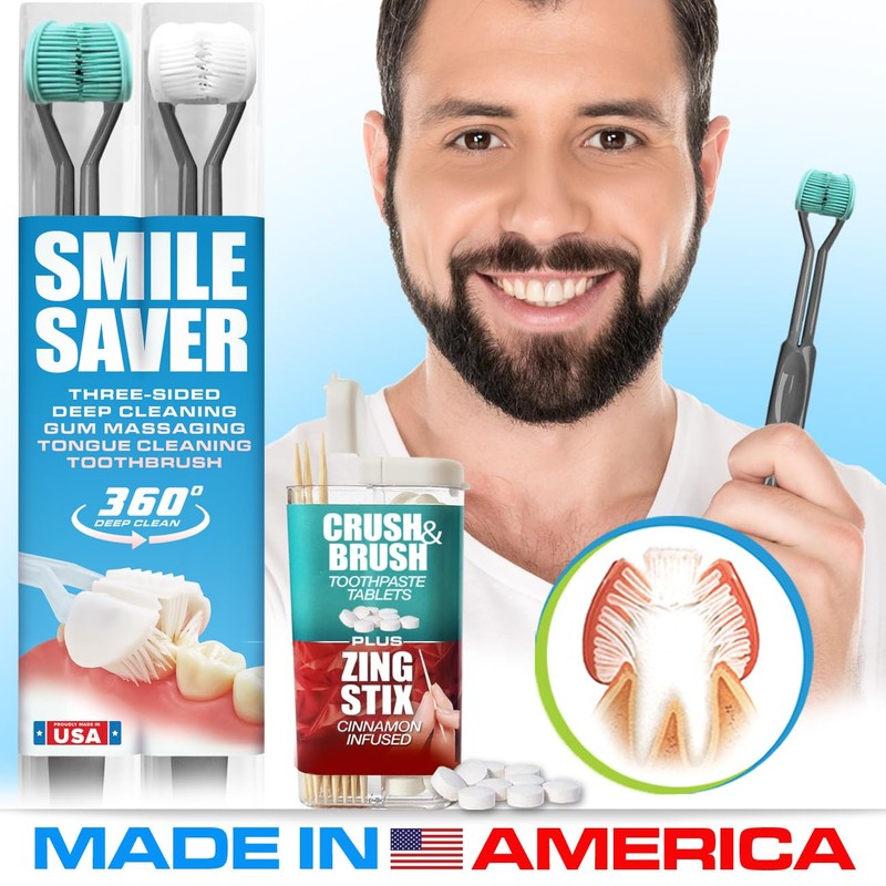 SMILE SAVER 360° 3-Sided Toothbrush 2PK + Toothpaste Tablets + Zing Stix Infused Toothpicks | Gum Massage & Tongue Cleaner | Teal & White Heads - Charcoal Handles - Cinnamon