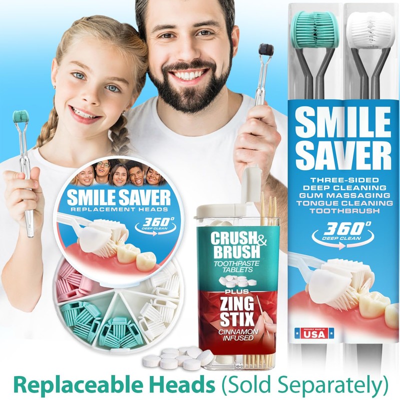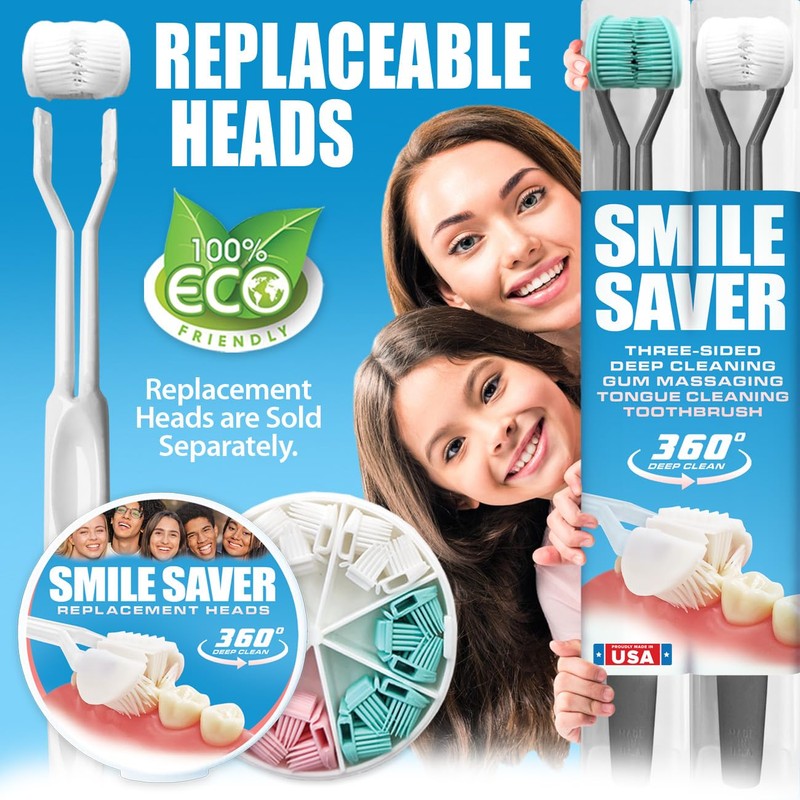 - REPLACEABLE HEADS ✨ The SMILE SAVER 360° 3-Sided Toothbrush features eco-friendly and cost effective replacement brush heads (sold separately) and reusable handles. The ideal oral care alternative for those looking to reduce their environmental impact while maintaining a healthy smile.