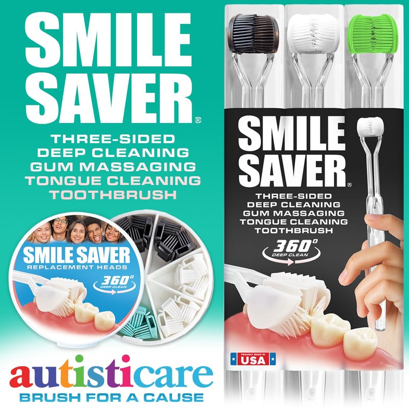 Special Needs and Disabilities: Dental care for people with autism and special needs offers very unique challenges. Without proper dental habits implemented early, many problems can come in later years. The SMILE SAVER 360° Three Sided Toothbrush has proven to be easier and more effective for the tactile and sensory needs of the autistic community.