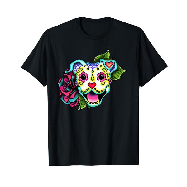 - This beautiful Dia de los Muertos design features a white Smiling Pit Bull adorned with filigree and flowers. This floppy eared pitbull terrier is decorated as a Mexican folk art sugar skull. Celebrate your furbaby with this unique tattoo inspired art!