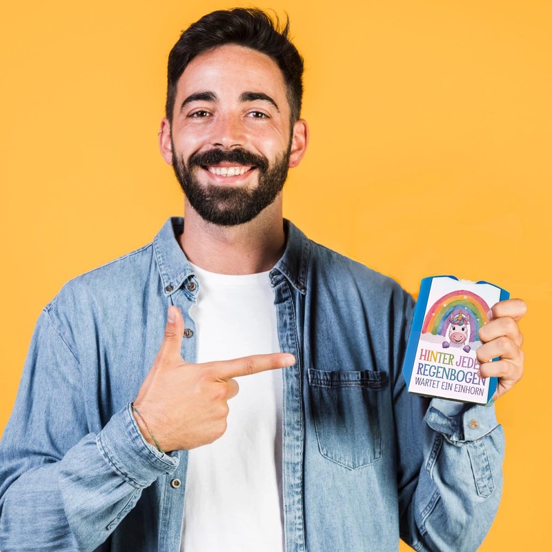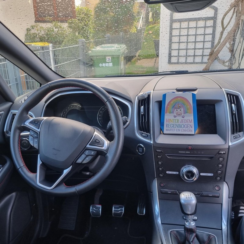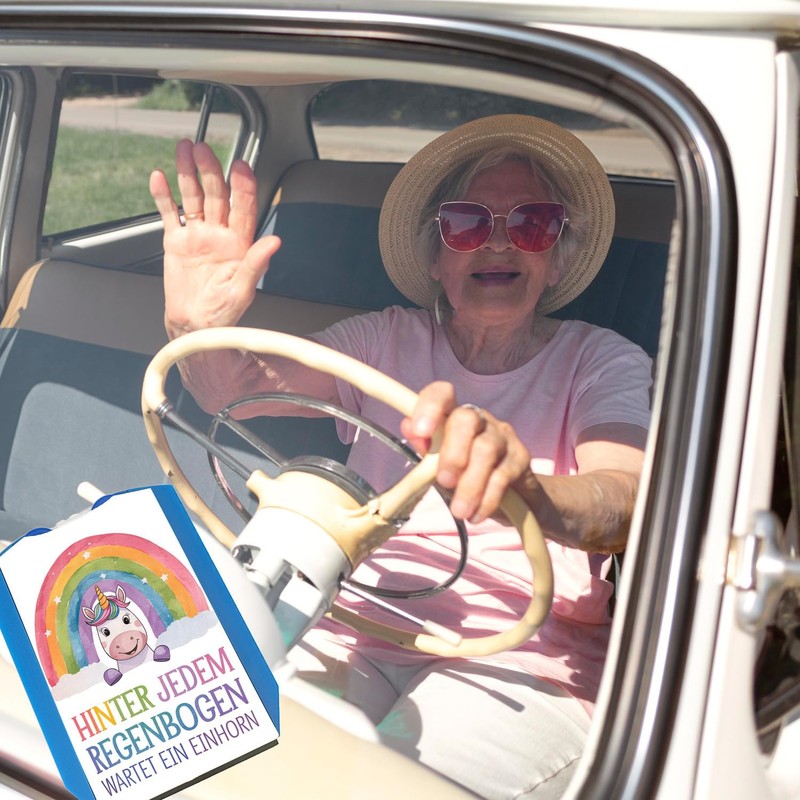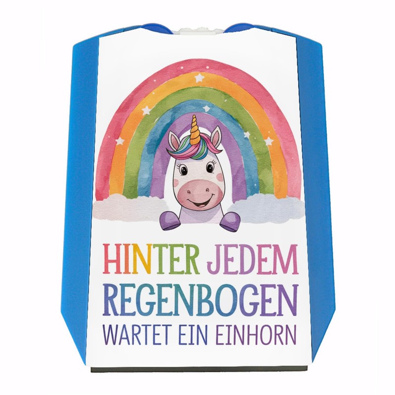 - This parking disc features a cheerful unicorn motif with a golden horn, a colourful mane and a playful tail. Surrounded by white clouds, the unicorn looks out behind a vibrant rainbow. The saying "Hinter jedem Regenbogenwartet ein Einhorn sorgt für ein Lächeln und erhellt den Tag.