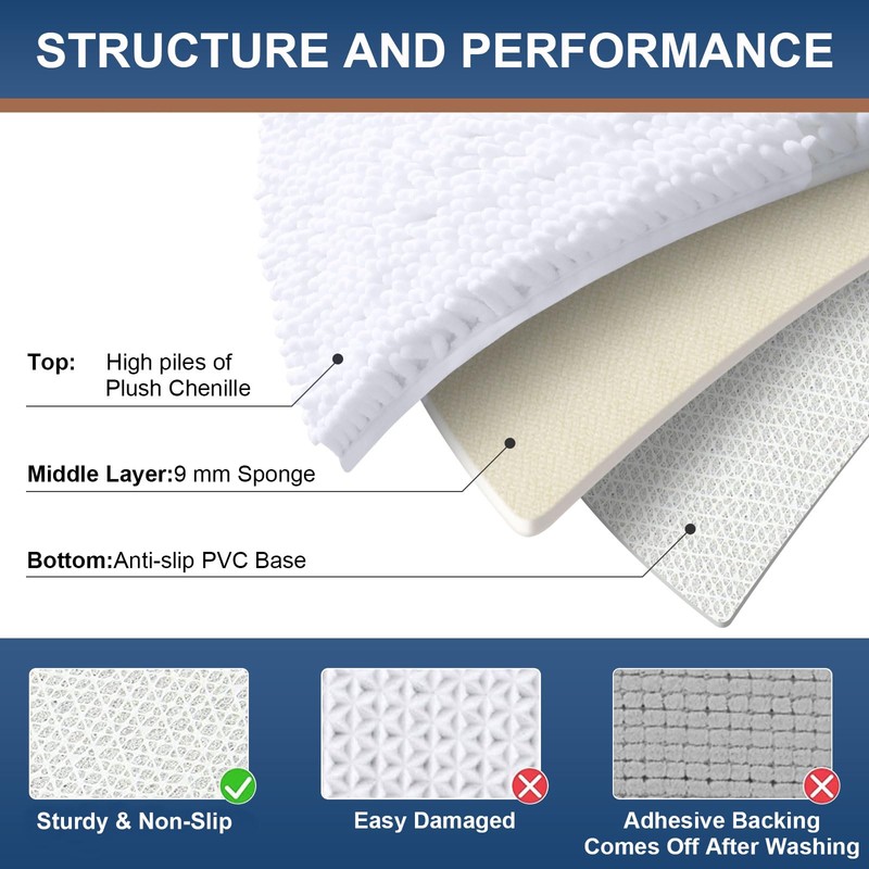 - [Non-Slip Backing] Our bath rugs feature a non-slip backing made from good quality mesh PVC, providing a secure grip that avoid shifting and skidding. Important: Place on CLEAN DRY FLAT FLOOR ONLY to avoid slipping. Keep the rug's bottom dry at all times.