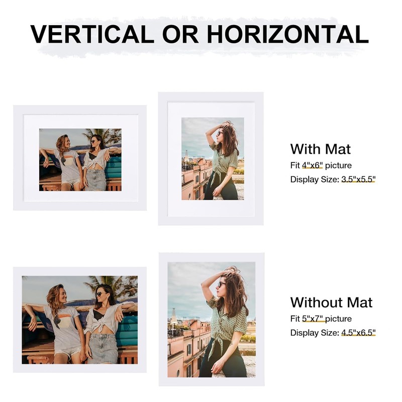 - Precise Dimensions: Our 5x7 picture frame can display pictures either horizontally or vertically. It accommodates 4x6 photos with the mat and fits 5x7 photos without the mat