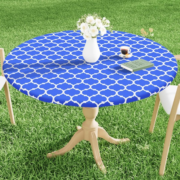 Smiry Round Picnic Tablecloth, Waterproof Elastic Fitted Table Covers for 18" - 24" Tables, Wipeable Flannel Backed Vinyl Tablecloths for Camping, Indoor, Outdoor, Blue & White