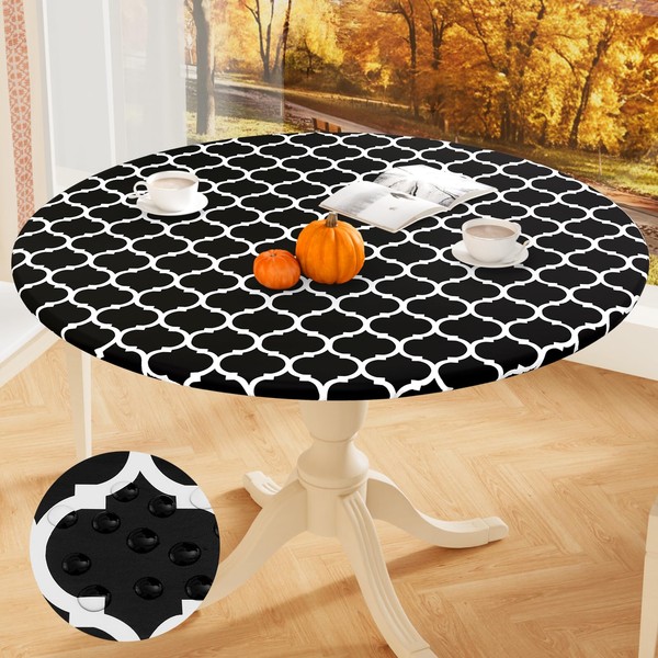 Smiry Round Picnic Tablecloth, Waterproof Elastic Fitted Table Covers for 45" - 56" Tables, Wipeable Flannel Backed Vinyl Tablecloths for Camping, Indoor, Outdoor, Black
