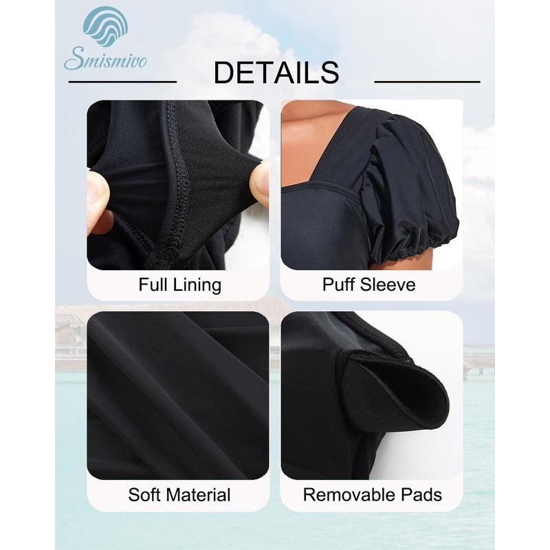 Smismivo Modest Swimsuits for Women Puff Cap Flutter Short Sleeve One Piece Bathing Suit High Neck Tummy Control Slimming Swimming Suits Full Coverage Ruched Swimwear for Pool (Black)