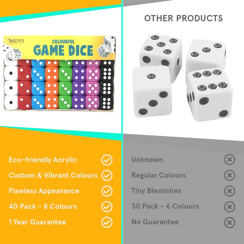 Smith’s® 40 Pack of Eco Friendly Dice | 16MM | 6 Sided Dice | No Harmful Materials | Rounded Edges for Smoother Rolling | 8 Beautiful Custom Colours