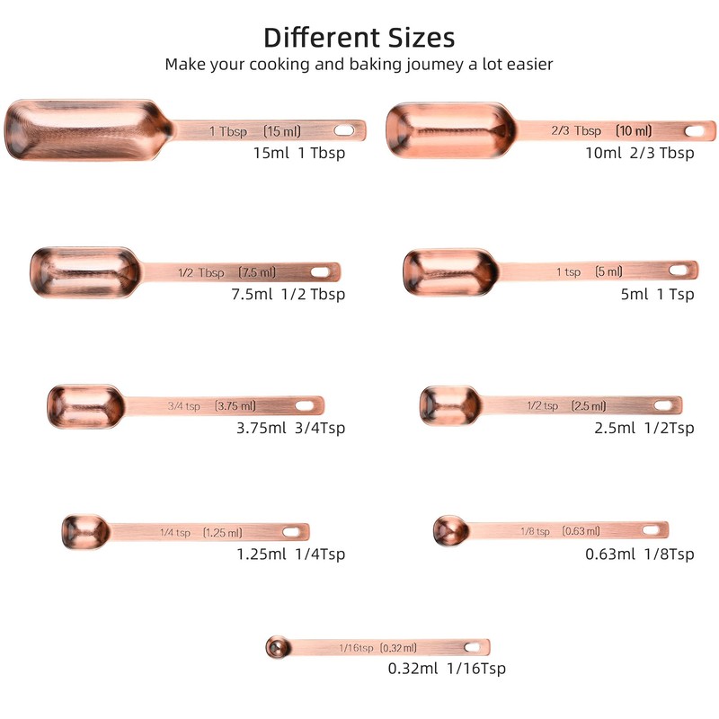 • COPPER MEASURING CUPS AND SPOONS: 7 measuring cups and 9 measuring spoons: