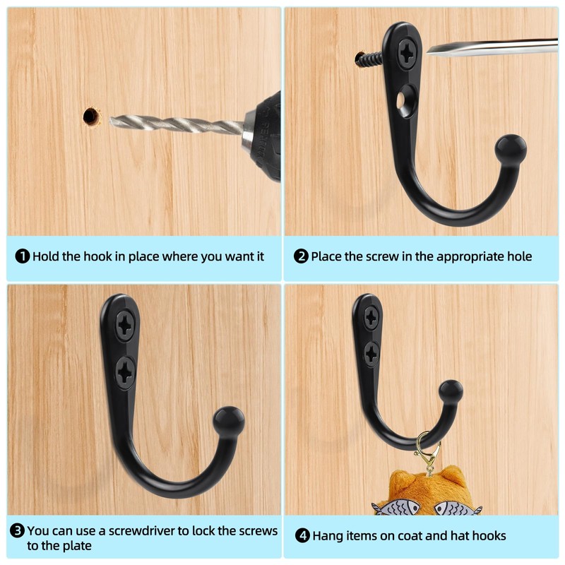 2. This black coat hooks set contains 20 hooks and 40 The matching mounting screws ensure that the installation process is stable and reliable, and there is no need to purchase additional mounting accessories. It can meet the daily clothing storage needs of your whole family.
