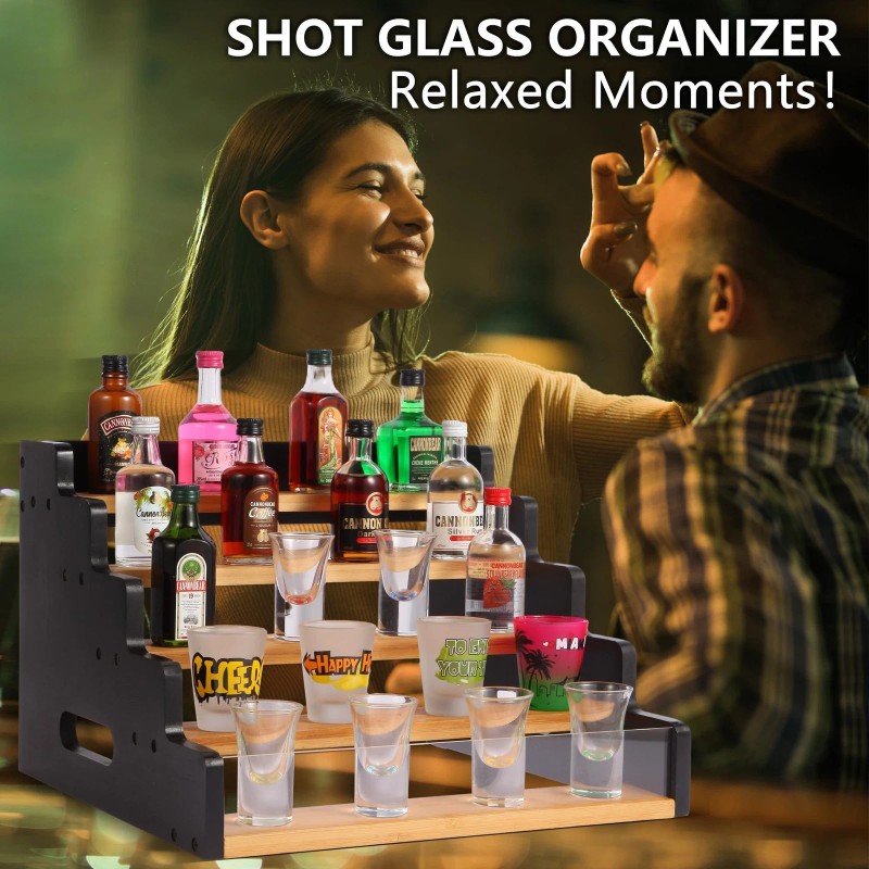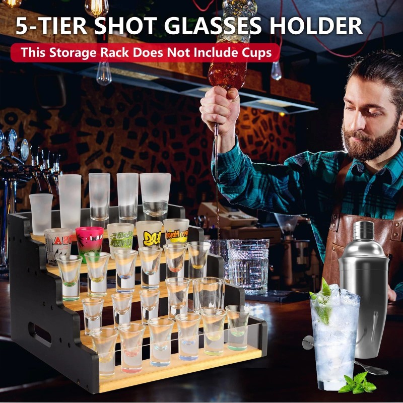 - LARGE CAPACITY STORAGE, EFFICIENT: This shot glass display rack has 5 layers of storage space, each layer of display rack is 2.4 inches wide. The wine glass rack will help you display and store display items such as wine glasses and spice bottles. The display rack can hold up to 35 shot glasses. Keep your desktop organized