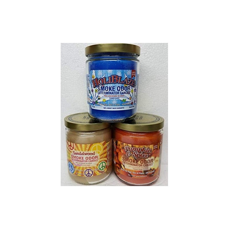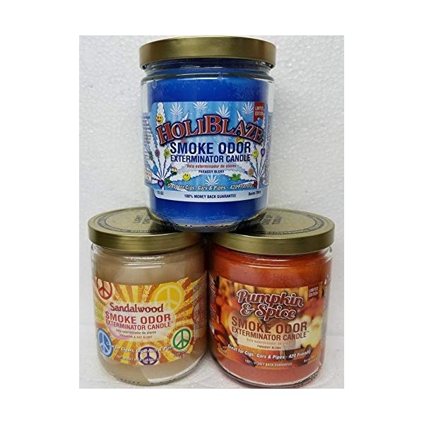 - Each candle burns approximately 70 hours 13 oz Smoke Odor Exterminator Candles Made in the USA Variety pack of (3) Includes HoliBlaze, Pumpkin Spice & Sandalwood. deliver to you as described above & shown as in the picture no changes in any Scents/fragrance.