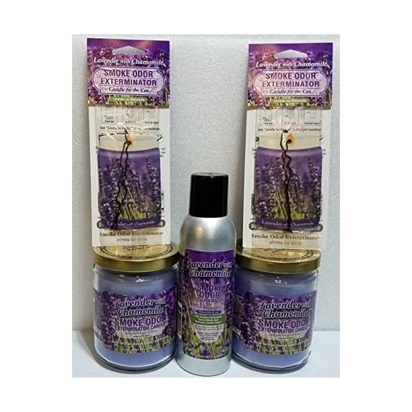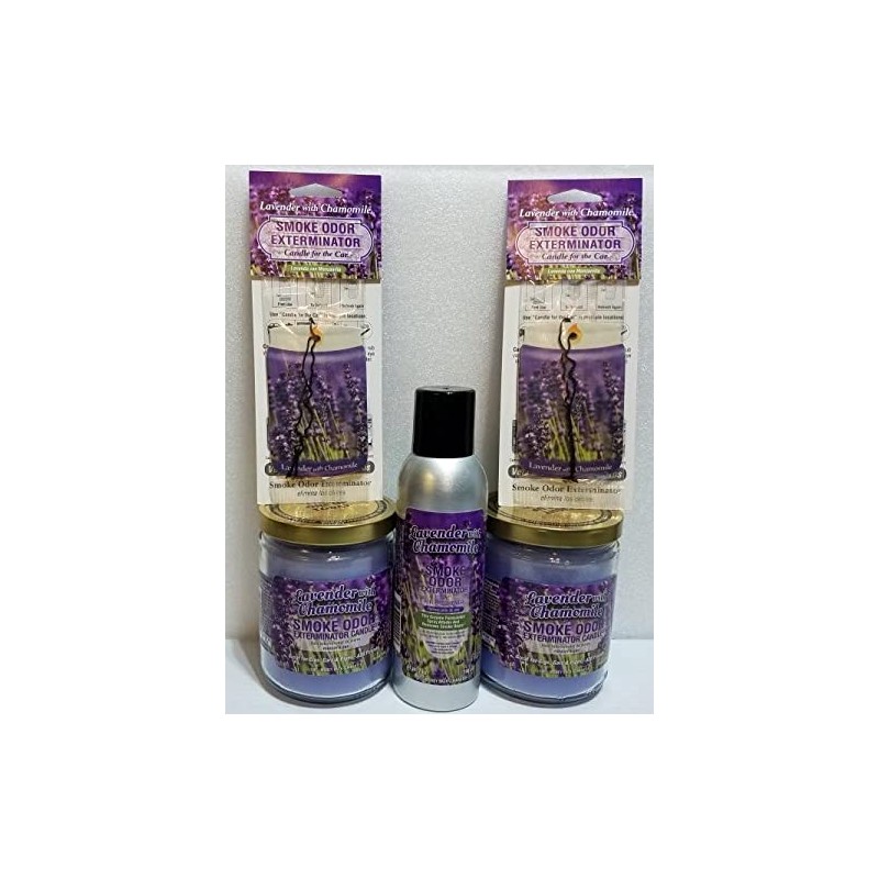 Smoke odor Exterminator Lavender with Chamomile, Includes Two 13 oz Jar Candle One 7 oz Spray & Two Car Hangers All in One Bundle.