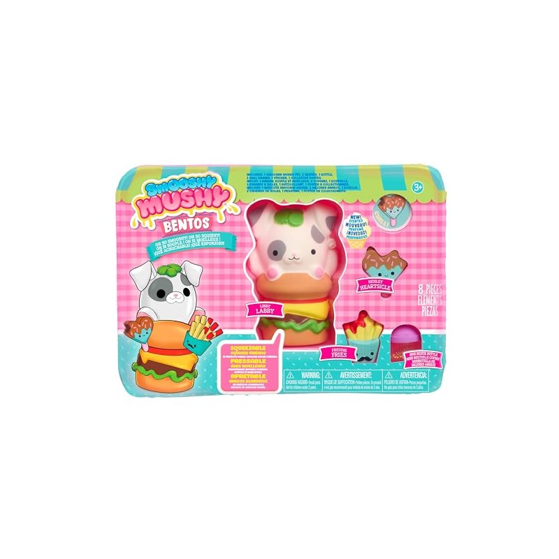 - Squeezable Sensory Fun: Find a squeezable, squishy friend – and lots of cool accessories with the Smooshy Mushy Bento Box Libby Labby set.