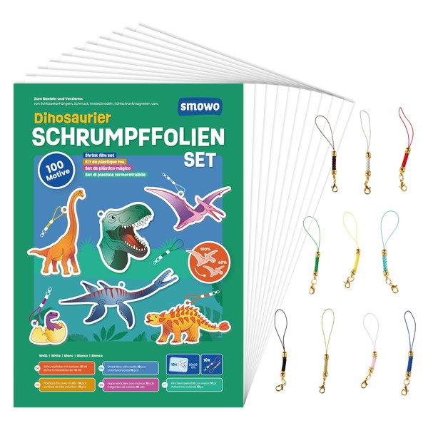 Smowo® 10 Dinosaur Shrink Films with Key Fob - Dino Craft Set with T-Rex & More - Shrinking Plastic Films with 100 Designs for Boys and Girls