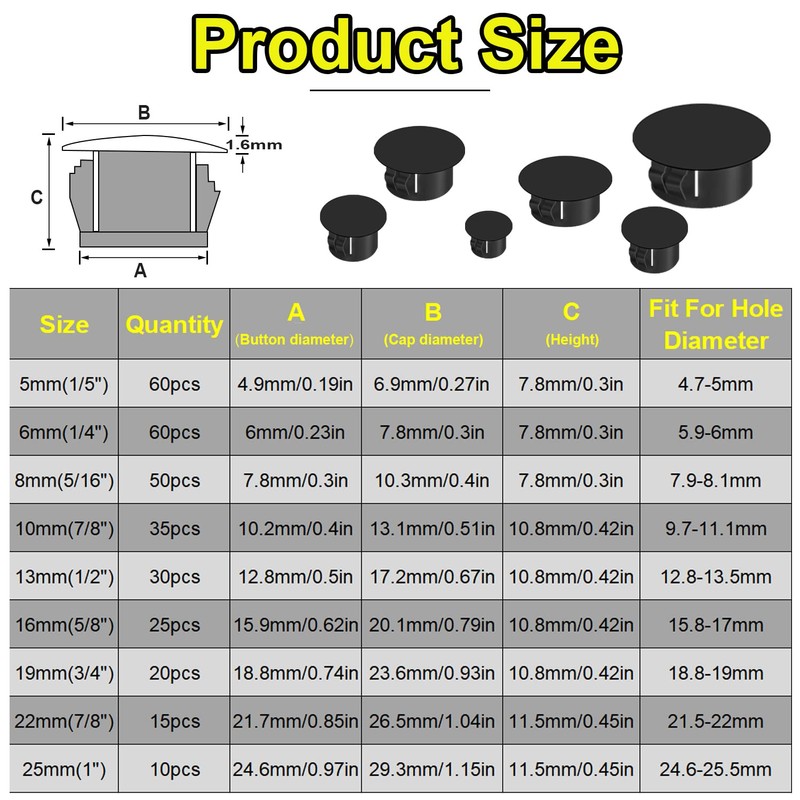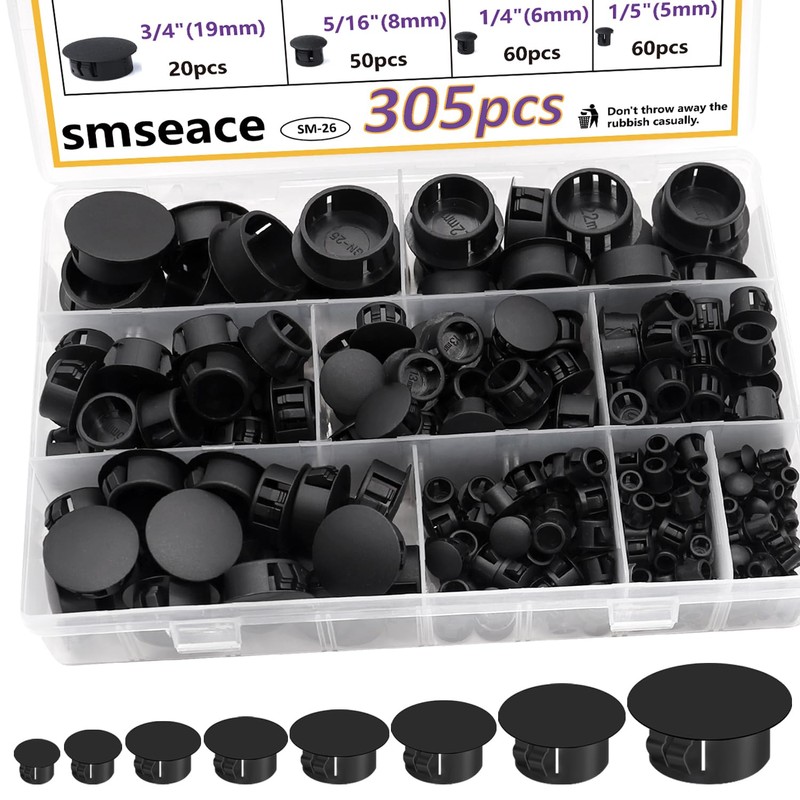 - ✔️Package:you will receive 9 sizes(305pcs) black plugs hole packed in plastic box,1/5inch(5mm) 60pcs,1/4inch(6mm) 60pcs,5/16inch(8mm) 50pcs,3/8inch(10mm) 35pcs,1/2inch(13mm) 30pcs,5/8inch(16mm) 25pcs,3/4inch(19mm) 20pcs,7/8inch(22mm) 15pcs,1inch(25mm) 10pcs.