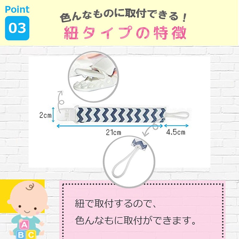 Since it is a string-type string, it can be used as a small hole in pacifiers, toys, etc. Clip clip material uses PE, so it is safe for your baby to put it in the case. The clips are textured and secure to the stroller or baby clothes.