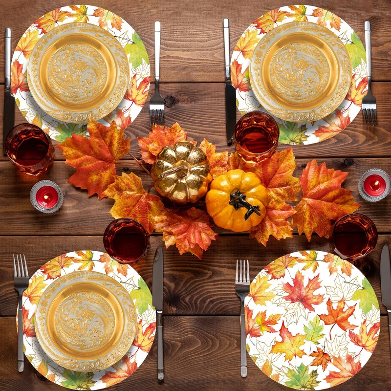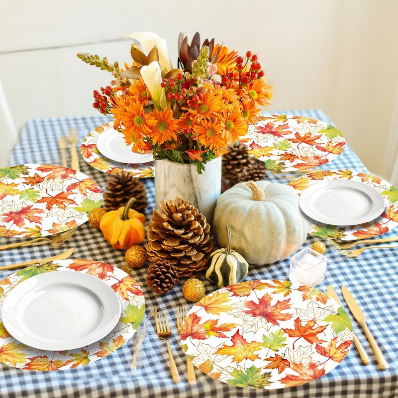 SMUAENSS Fall Paper Placemats Disposable Thanksgiving Paper Place Mat 13.5 Inch Maple Leaves Harvest Round Table Mats Decor for Wedding Bridal Thanksgiving Harvest Party