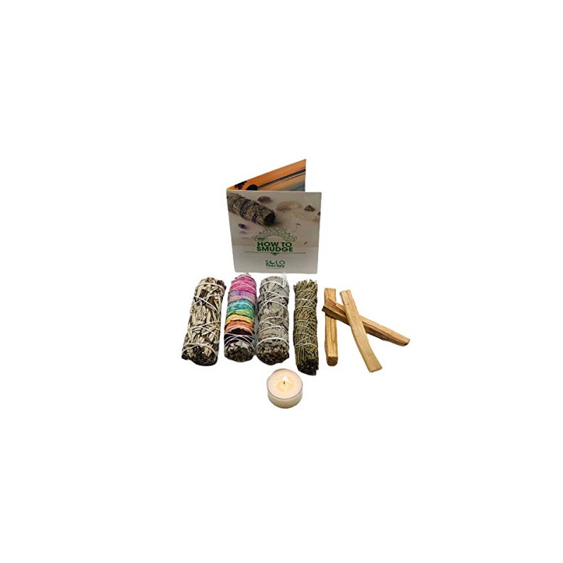 Smudge Kit Spiritual Set - White Sage, Cedar, 7 Chakra Sage, Yerba Santa, Palo Santo, Sandalwood T-Lite Candle - for Purifying, Cleansing, Meditating, Blessing, Manifesting, Love (Smudge Kit)