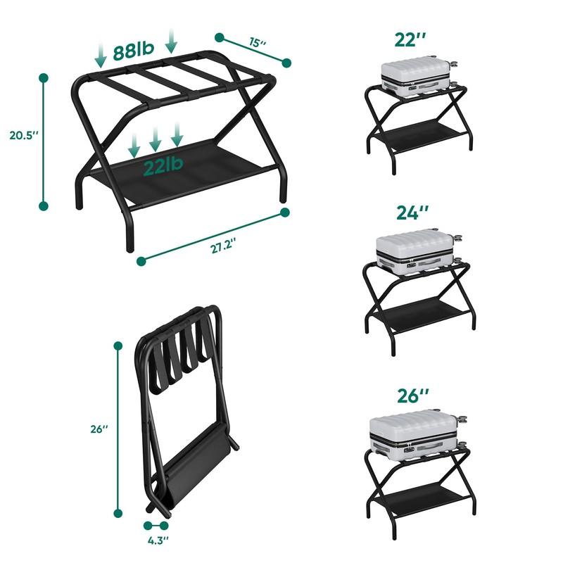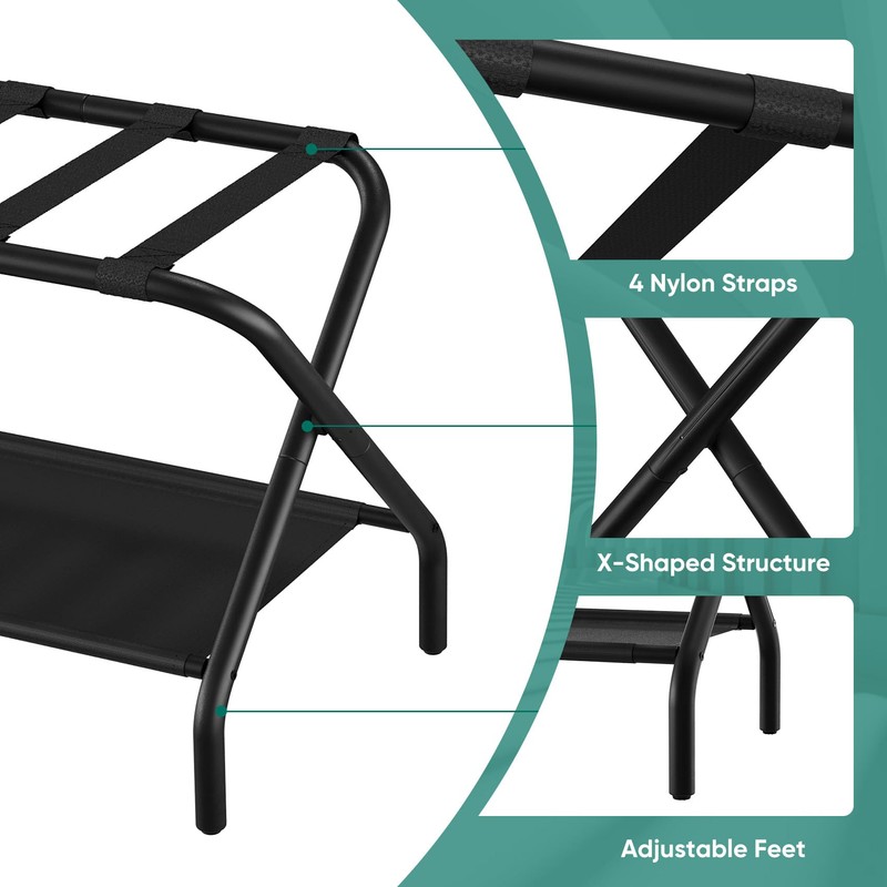 - 【Sturdy and Stable】This luggage rack has 2 tiers, 4 nylon straps fastened to a metal iron frame with a base layer made of polyester fabric. Each luggage rack can hold up to 88lbs on the top shelf and 22lbs on the bottom shelf.