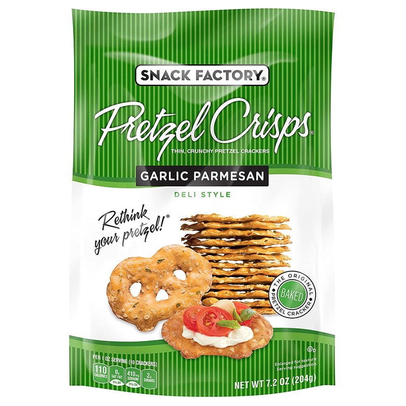 - Thin, crunchy pretzel crackers, baked with savory garlic and Parmesan flavors