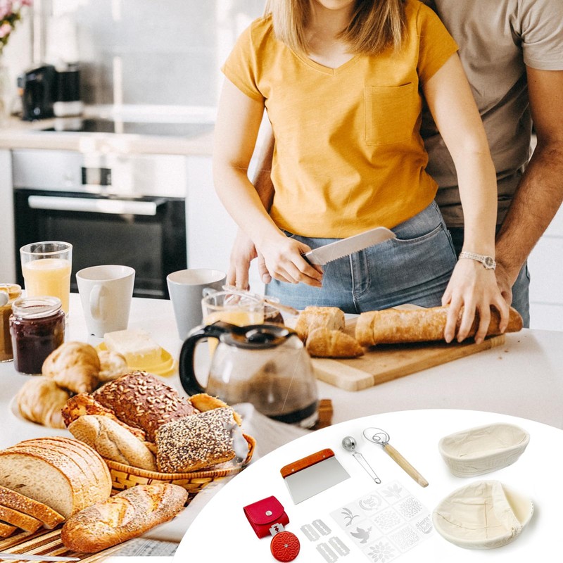 - 【Practical Bread Making Kit-Meet Your All Need】Equipped with essential tools for making bread,you will get 1pcs 9 inch &10 inch bread proofing basket with linen liners, 1pcs bread lame with 5 blades, 1pcs dough whisk, 1pcs metal scraper, 1pcs flour duster, and 9 different styles of baking stencils.Rich sourdough bread making kit, 2 sizes baskets, which can enhance your bread making experience and make your production process simpler.