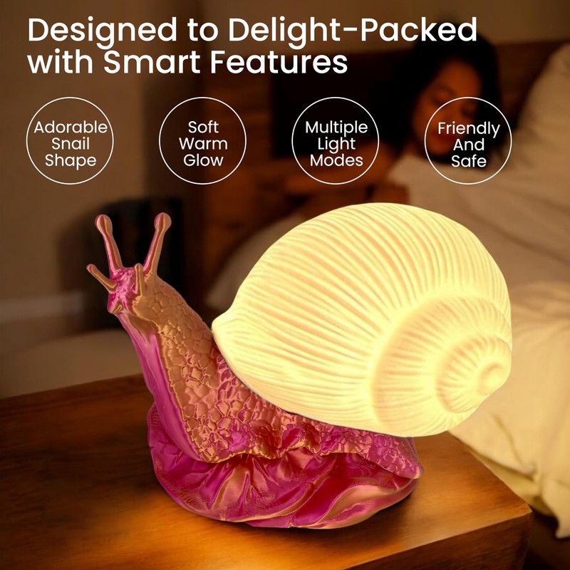 - 🐌 Adorable Snail Night Light for Kids & Nursery This 3D-printed LED lamp is the perfect night light for children’s bedrooms, nurseries, and playrooms. Its soft, warm glow provides a gentle, comforting light for bedtime, making it ideal for toddlers, babies, and kids who need a soothing sleep environment.