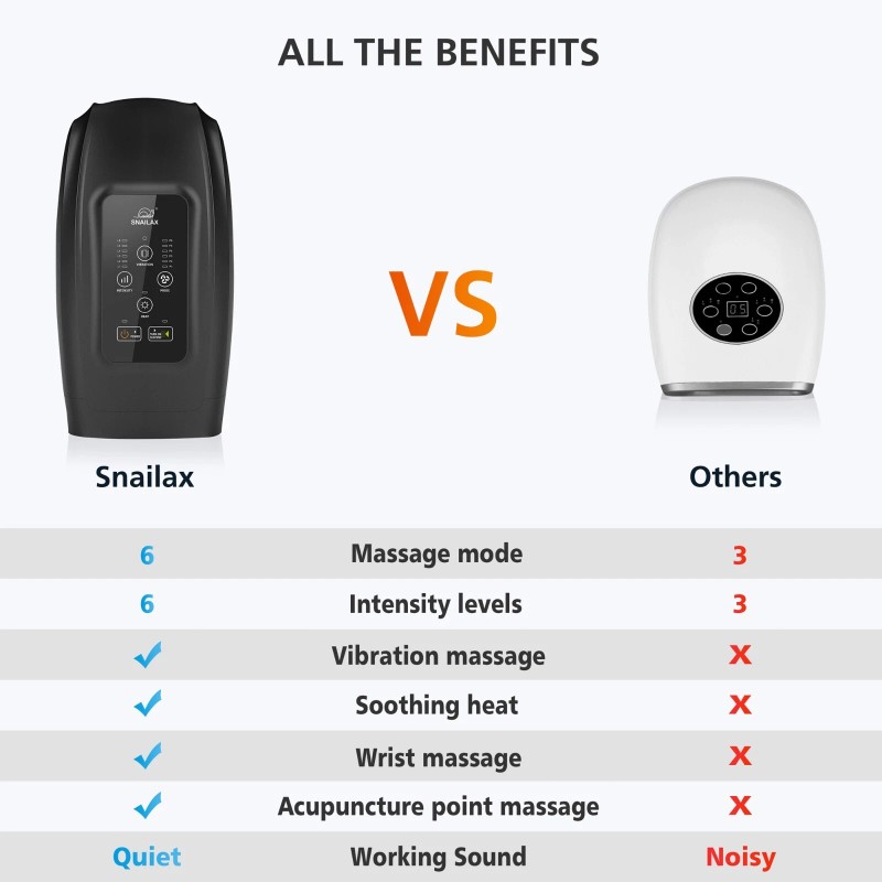 - Comprehensive care for your hand,Snailax hand massager utilizes pressure,vibration and heat massage to care for all parts of your hand, helping to get rid of finger numbness, joint soreness, relieve the pain from arthritis and carpal tunnel,relax your hand after a hard day's work.
