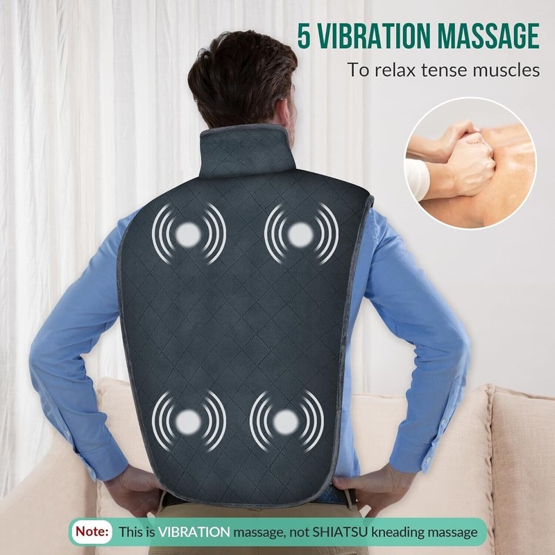 Snailax electric heating pad is in a large size and perfect contour that fully covers the neck and shoulders,back, providing soothing heat and vibrating massage to help relieve stress,tense and fatigue.