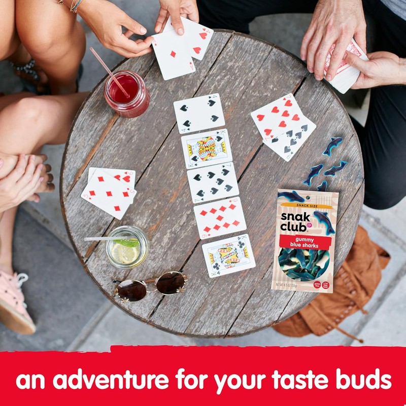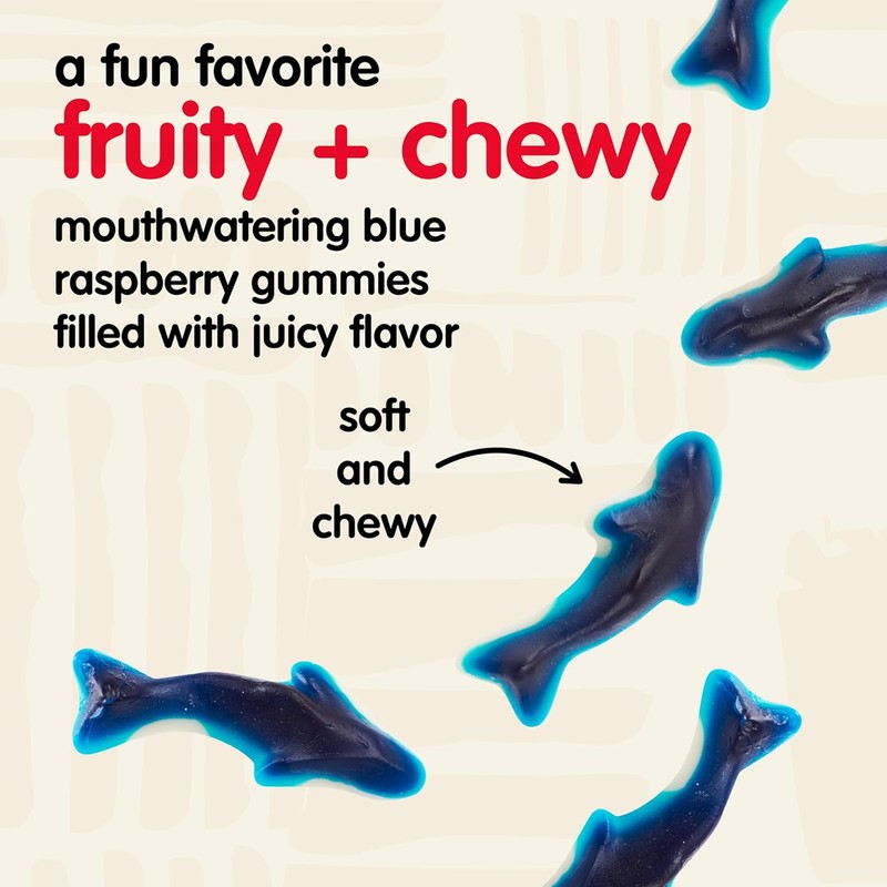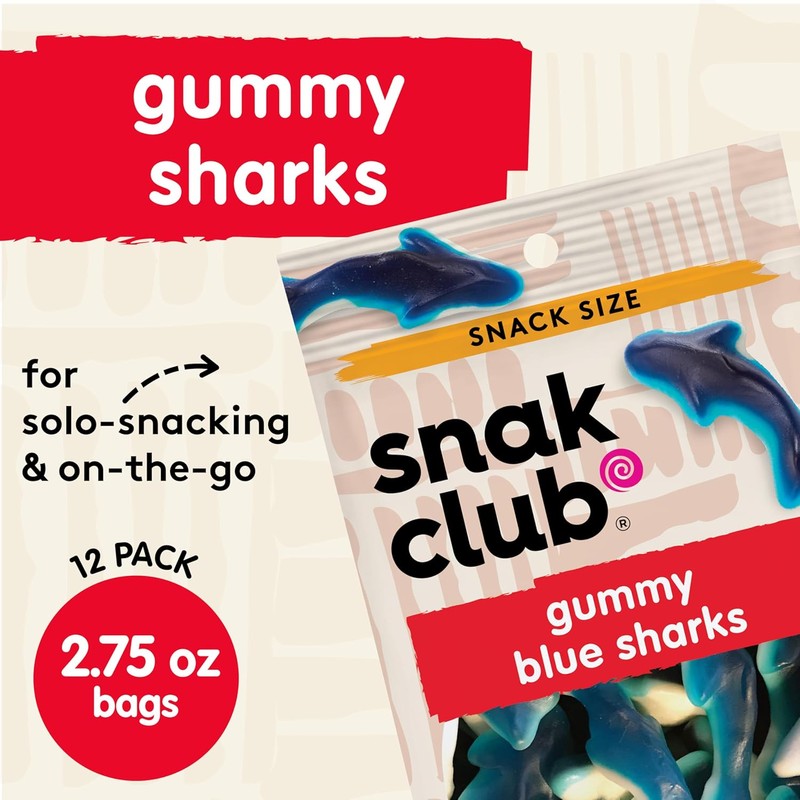 About this item Classic Gummy Shark Candy: Dive into fruity fun with these chewy blue raspberry gummy sharks. Soft, bold, and deliciously playful, they deliver a wave of fruity flavor in every bite with just the right splash of nostalgia. A Fun Favorite: Made in our state-of-the-art facility, these tasty shark gummies are packed with nothing but greatness. These gummy candies are also fat-free and gluten-free, making them a great snack choice for the whole family. Snacks for Every Occasion: Our candies redefine everyday snacks for gourmet snack lovers with juicy flavor in every bite. The soft, chewy candies are awesome as party treats, travel snacks, or for at-home munching. Individual Pouches: The 2.75 oz snack bags make them the perfect sweet treat for solo-snacking or taking on the go. Grab a bag for family movie night, a road trip, office treat, lunch snack, and more. Other Snak Club Cravings: We don’t stop at classic candies. We also offer bold Tajin covered gummy bears and fruit rings, trail mixes, and a wide variety of delicious nuts. From sweet and spicy to crunchy and bold, join the Snak Club revolution.
