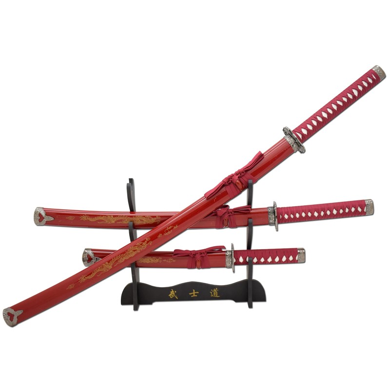 - Each sword has a hardwood scabbard w/ Two Tone Dragon Design Finish.